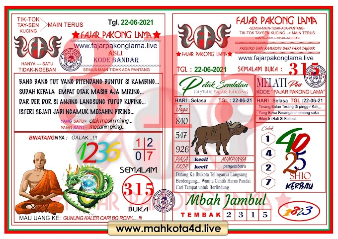 Syair Prediksi Fajar Pakong Lama Selasa, 10 - Agustus - 2021. Agustus 09, 2021. Syair Prediksi Jitu Fajar Pakong 888 Jum'at, 15 - Oktober - 2021. Oktober 14, 2021. Syair Prediksi Fajar Pakong Lama Senin, 09 - Agustus - 2021. Agustus 08, 2021. Menu Footer Widget Home; About; Pakong Mahkota Pandawa; Fajar Pakong Melati; Prediksi SDY 13 Juni 2021. Syair SYDNEY Hari Ini merupakan sebuah gambaran dari sekumpulan ramalan ramalan hongkong yang tersebar di dunia maya saat ini apabila anda merupakan pamain togel lama maka pastinya sudah tidak asing lagi dengan hal hal ini dan tidak bisa di pungkiri bahwa syair togel ini banyak menjadi acuan dalam memasang taruhan.